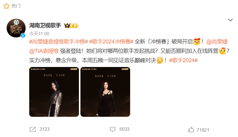 《歌手2024》播出后,好多网友王人喊话《乘风2024》节目组,但愿节目组可以让尚雯婕和袁娅维去参与录制《歌手2024》,这亦然对她们实力的一种认同,但从其时的情况上看,尚雯婕和袁娅维录制的可能性并不大,可看到《歌手2024》发出的音书后,“歌手官宣尚雯婕袁娅维冲榜歌手”话题转眼登上热搜。